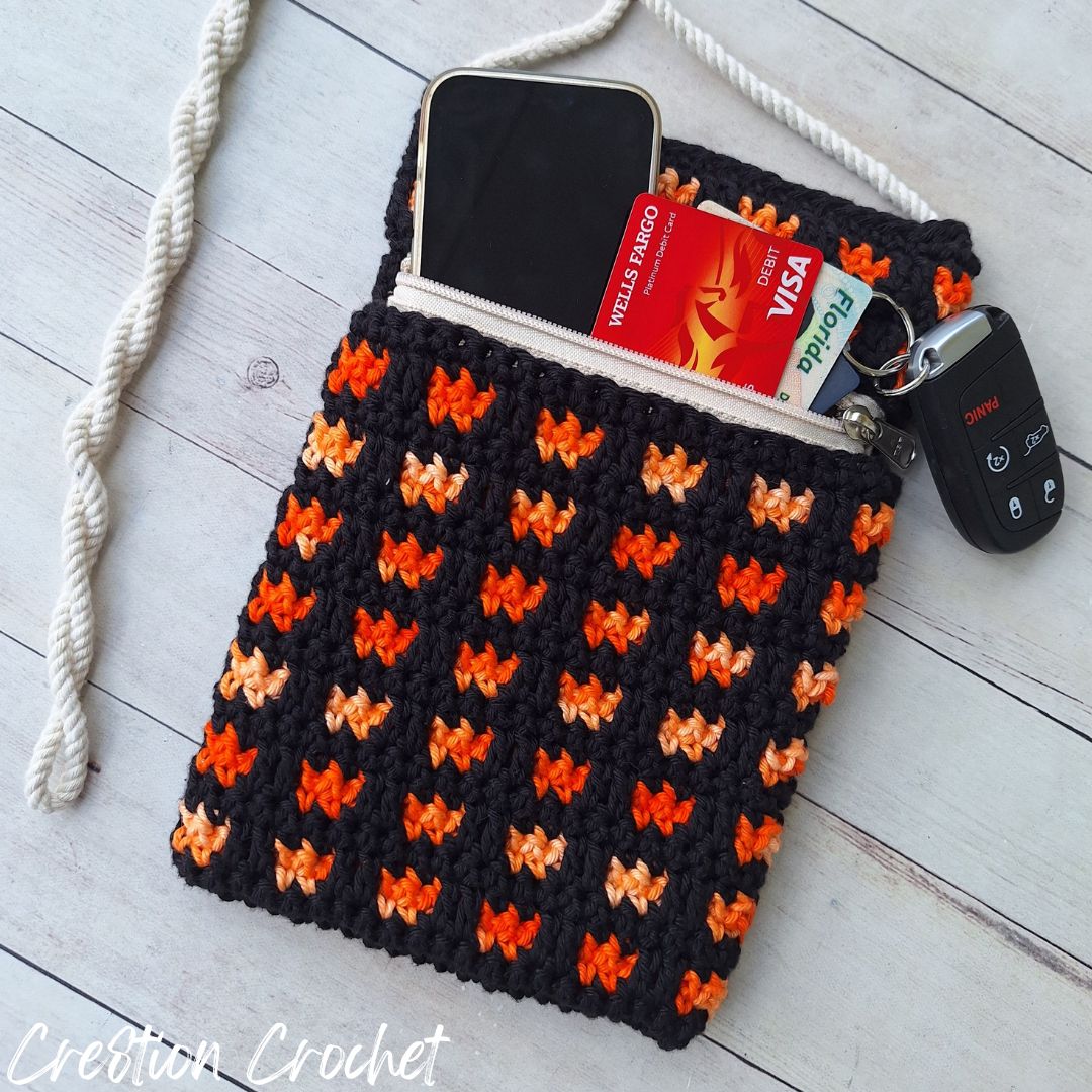 When I originally planned this Halloween Event, I knew I wanted to share a trick or treat bag and something to coordinate with it. After a little brainstorming, I thought “how cute would a matching bag for Mom be to hold her phone and keys while trick or treating with the kids?” and boom! My new favorite crocheted bag was born.